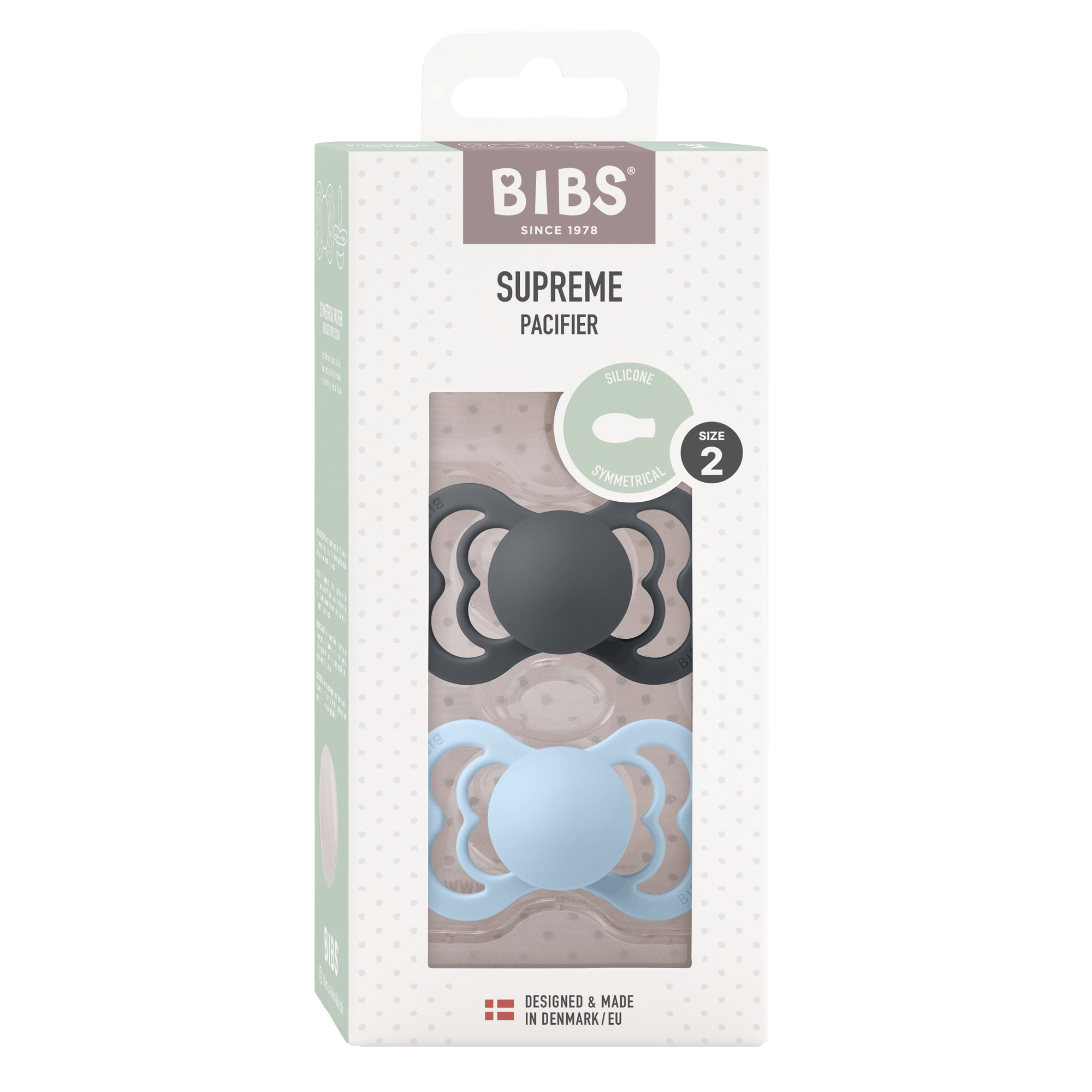The BIBS Supreme 2 Pack Silicone Size 2 Iron/Baby Blue is the perfect pacifier for your child's needs.