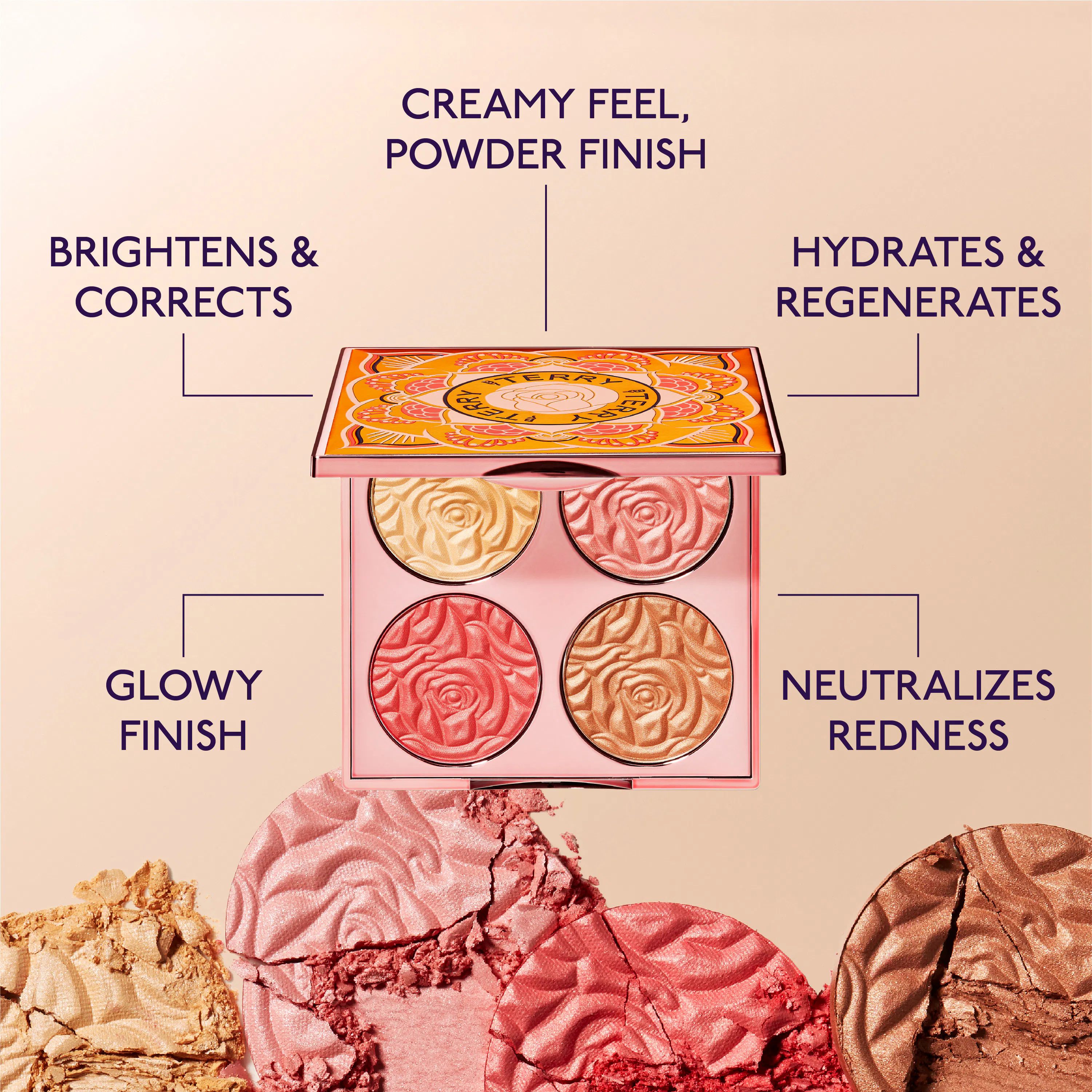 It’s a brightening powder, color corrector and cheek highlighter in one! Highlighter palette. Illuminating powder. Skincare infused formula. Enriched with rose extracts.