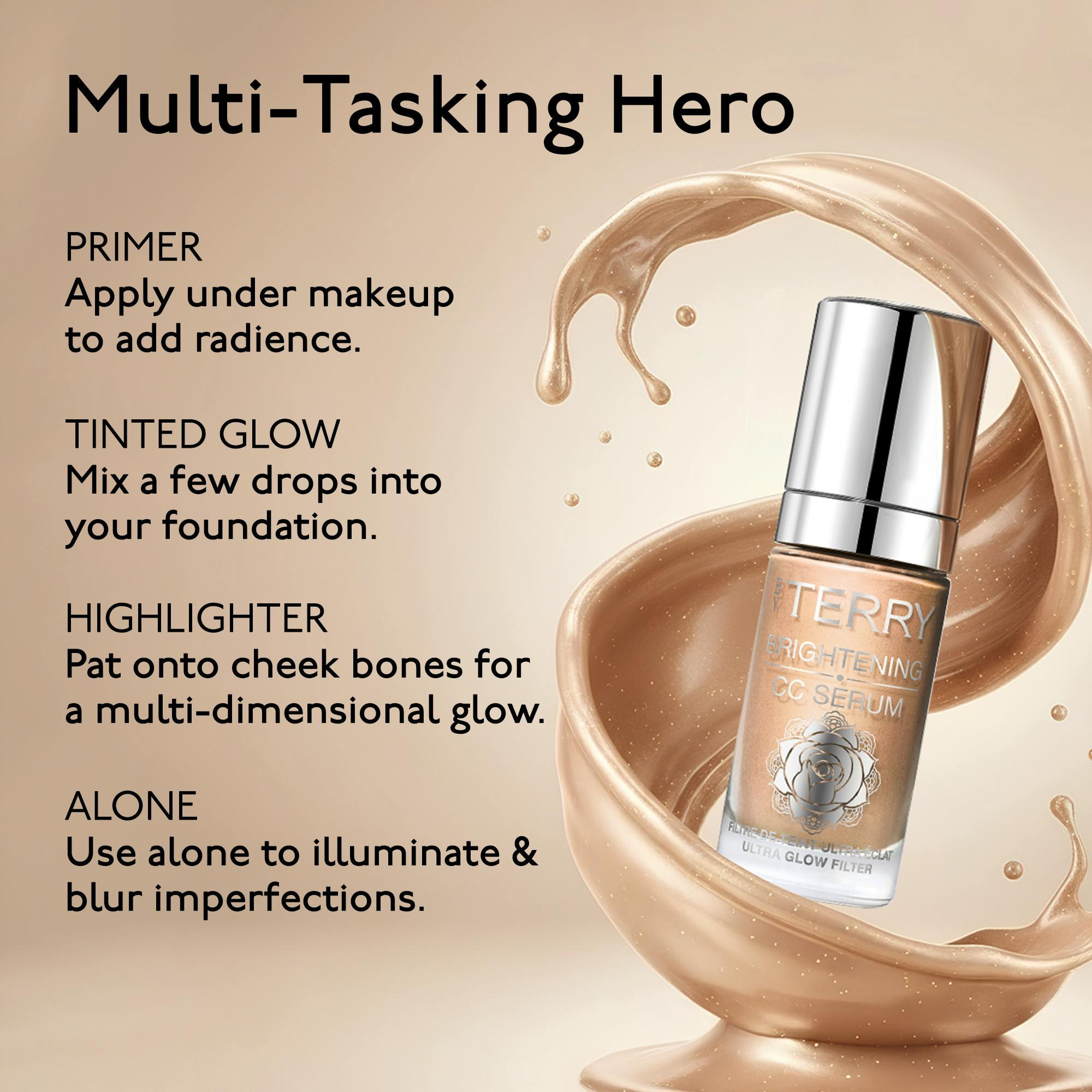 Apply alone for a natural glow that enhances the skin's healthy radiance. Use as a primer under foundation to boost luminosity, smooth imperfections and prolong makeup wear. Blend into foundation or moisturizer for a tailor-made glow that adapts to every routine, from minimalist everyday looks to luminous evening makeup