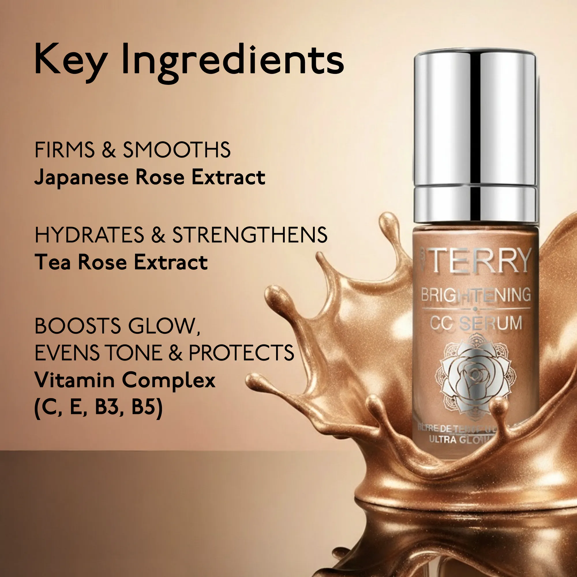 At the heart of the formula, Japanese Rose Extract rejuvenates, smooths and firms the skin, while Tea Rose Extract hydrates, soothes and strengthens the skin barrier. A 4-Vitamin Complex (C, E, B3, B5) boosts glow, evens tone and protects the skin from external aggressors.