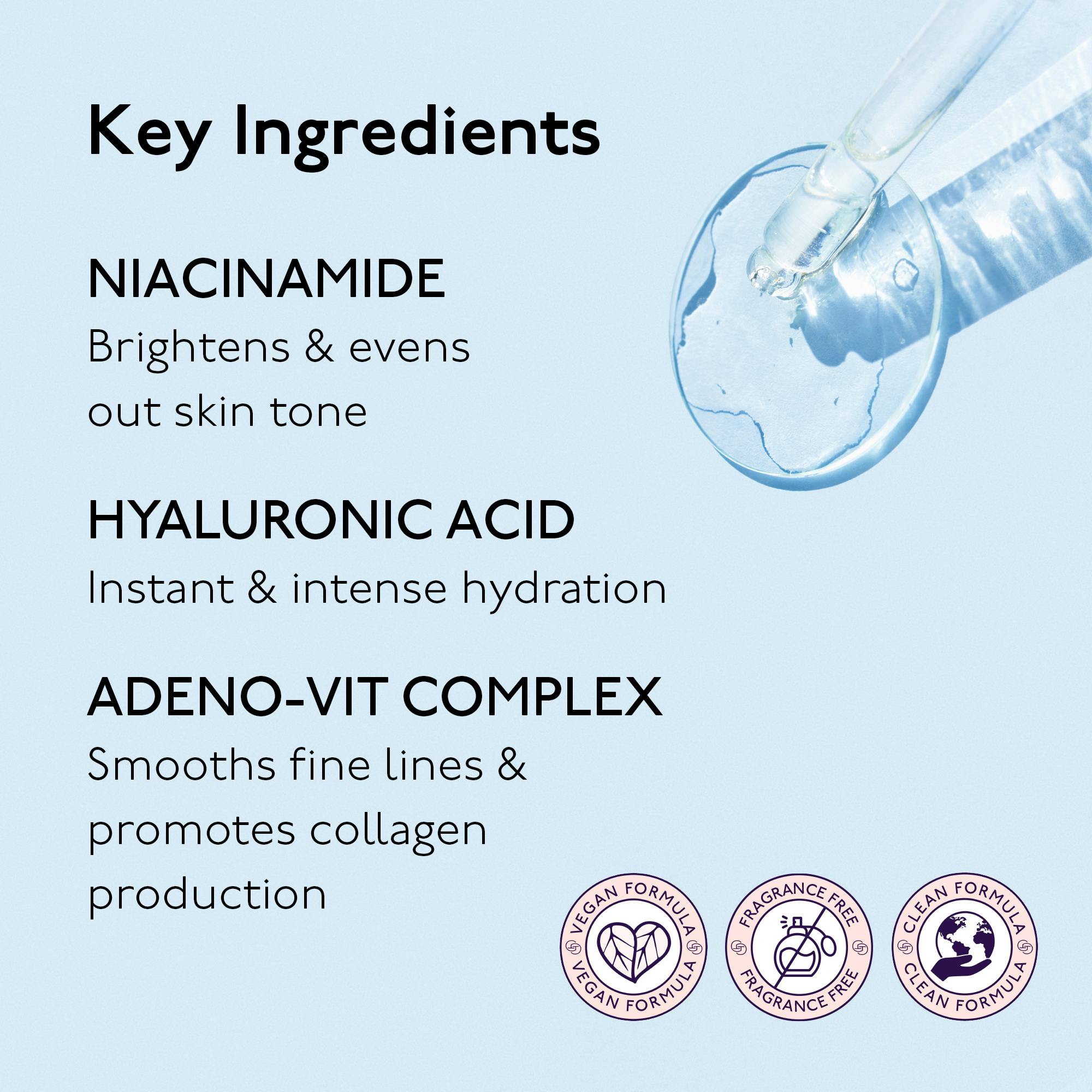 • Niacinamide: brightens and evens out skin tone, improving texture and providing a natural glow.