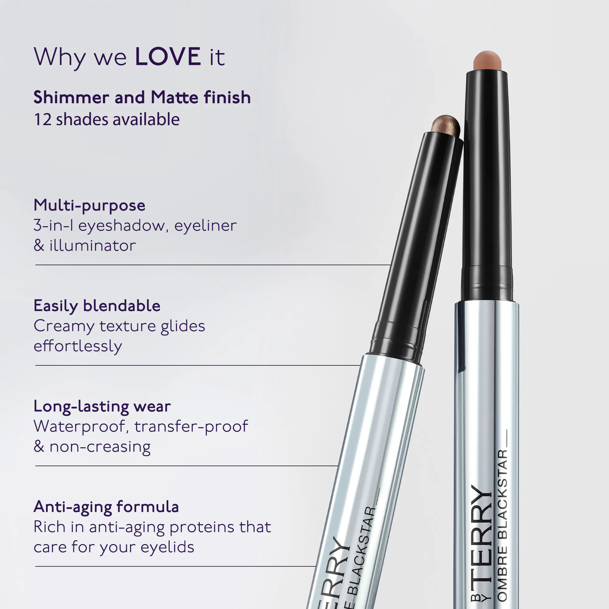 Bestselling 3-in-1 creamy eyeshadow. Eyeliner, illuminator, and eyeshadow. Anti-ageing formula. Buildable coverage for both subtle and dramatic looks. Matte & Shimmer finish. Travel friendly.