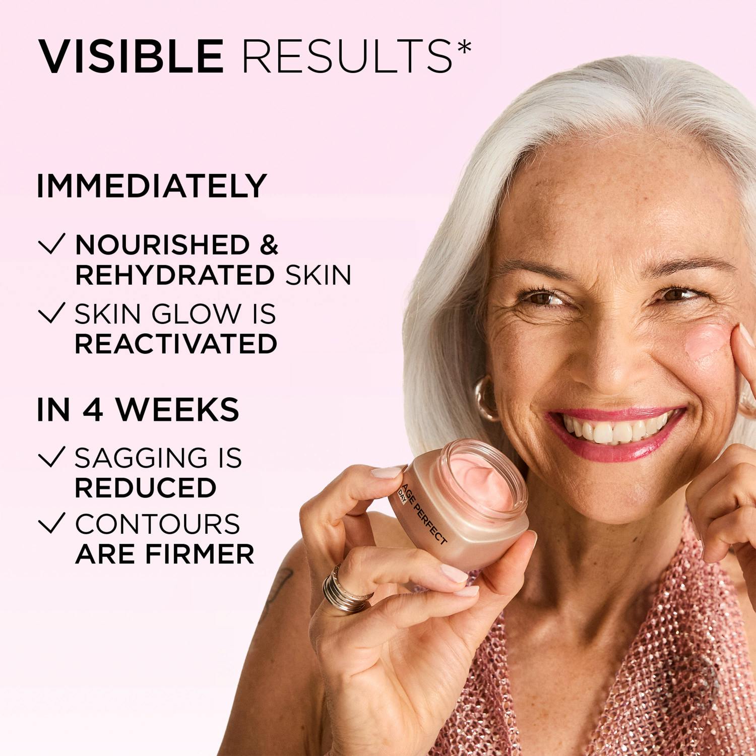 - The skin feels both fuller and firmer and gradually regains its natural color and a natural rosy glow.