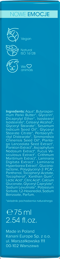 Ingredients: Aqua (Water), Bu- tyrospermum Parkii (Shea) Butter, Glycerin, Dicaprylyl Ether, Isostearyl Isostearate, Cetearyl Alcohol, Glyc- eryl Stearate, Sesamum Indicum (Sesame) Seed Oil, Glyceryl Stearate Citrate, Pentaerythrityl Distearate, Simmondsia Chinensis (Jojoba) Seed Oil, Plantago Lanceolata (Ribwort Plantain) Seed Extract, Plankton Extract, Ascophyllum Nodosum Extract, Fucus Vesiculosus Extract, Crithmum Maritimum (Sea Fennel) Extract, Laminaria Digita- ta Extract, Laminaria Hyperborea Extract, Gluconolactone, Polyglyc- eryl-3 PCA, Panthenol, Tocopheryl Acetate, Tocopherol, Xanthan Gum, Lactic Acid, Citric Acid, Calcium Gluconate, Glyceryl Caprylate, Sodium Levulinate, Potassium Sorbate, 1,2-Hexanediol, Sodium Benzoate, Parfum (Fragrance), Tetramethyl Acetyloctahydronaph- thalenes, Hexamethylindanopyran (Galaxolide).
