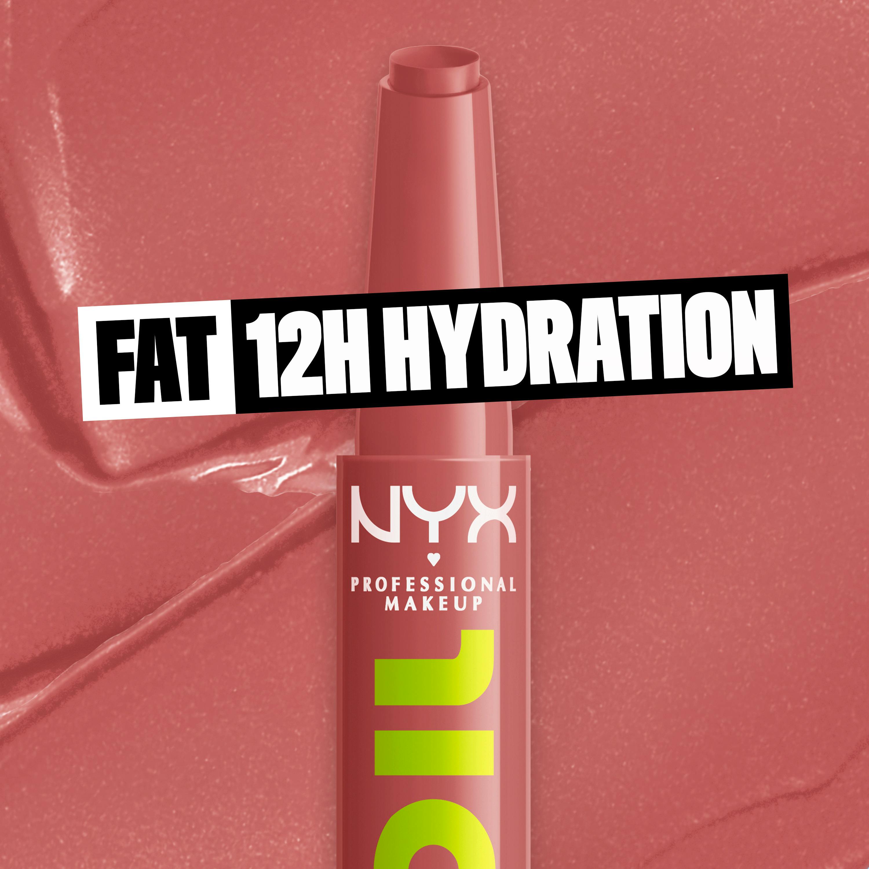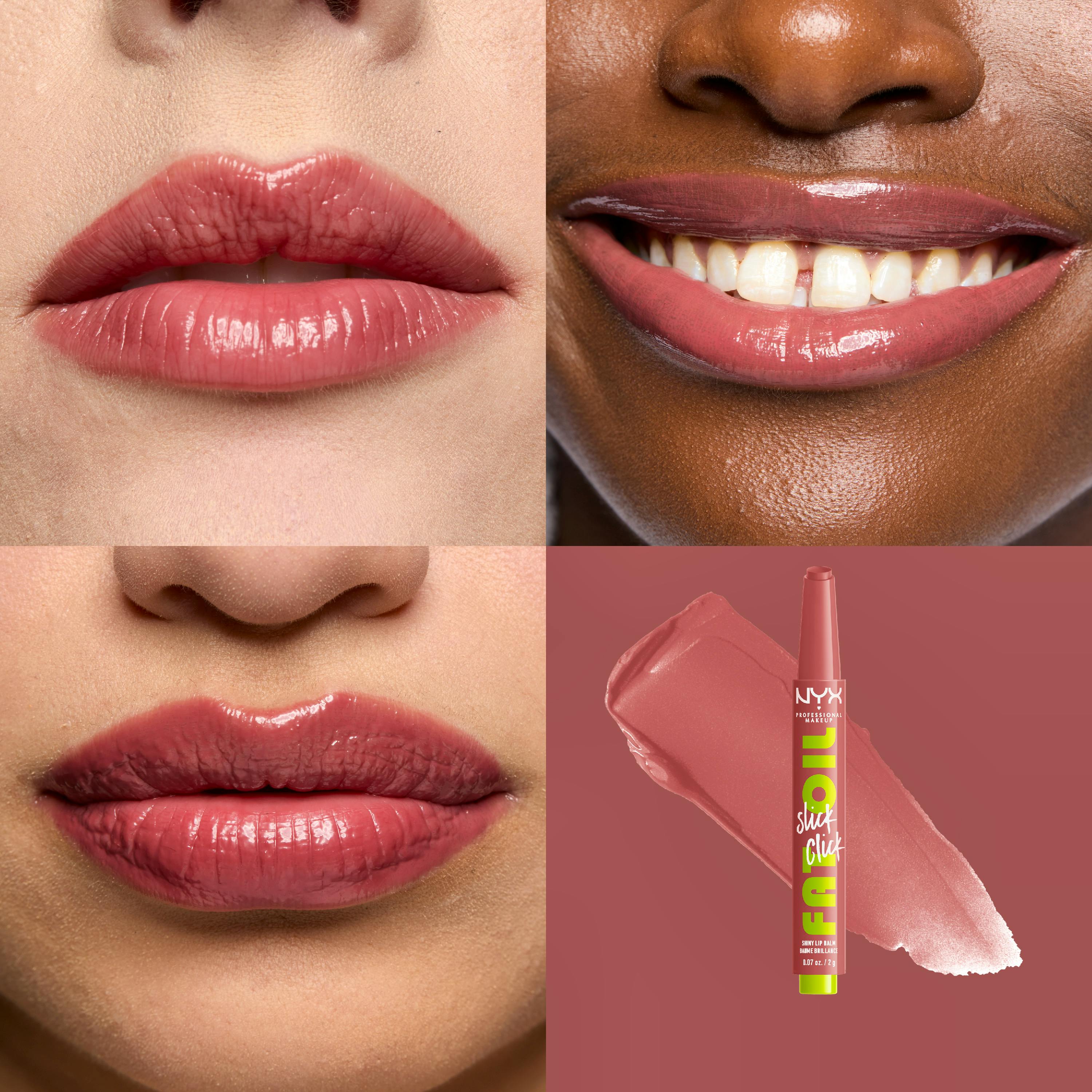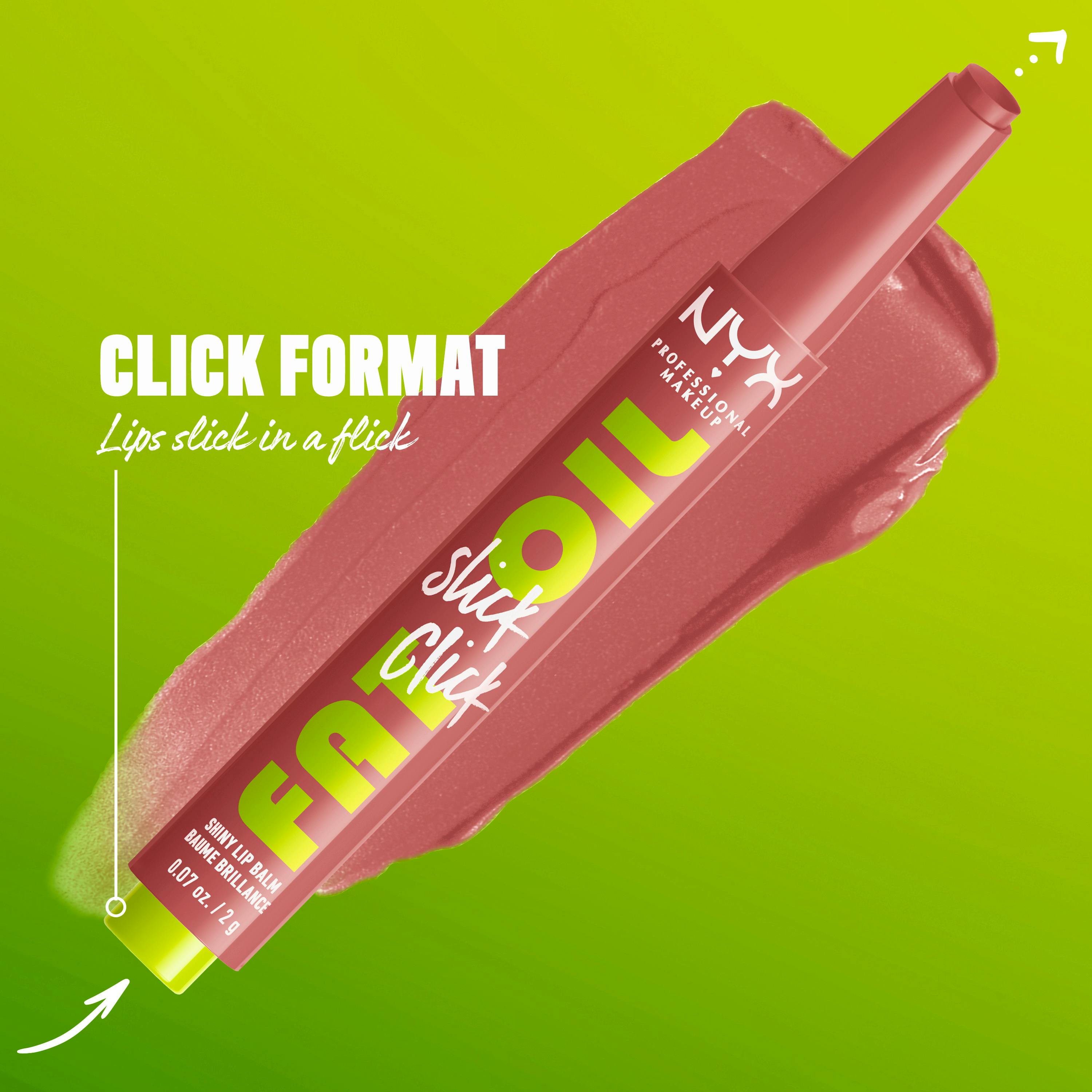 Lips on slick in just a click! NYX Professional Makeup Fat Oil Slick Click is a pigmented balm in a click up packaging that dispenses just the right amount of formula. Get a fat boost of fat care for your lips with this vegan formula* powered by avocado, cloudberry and raspberry oils.