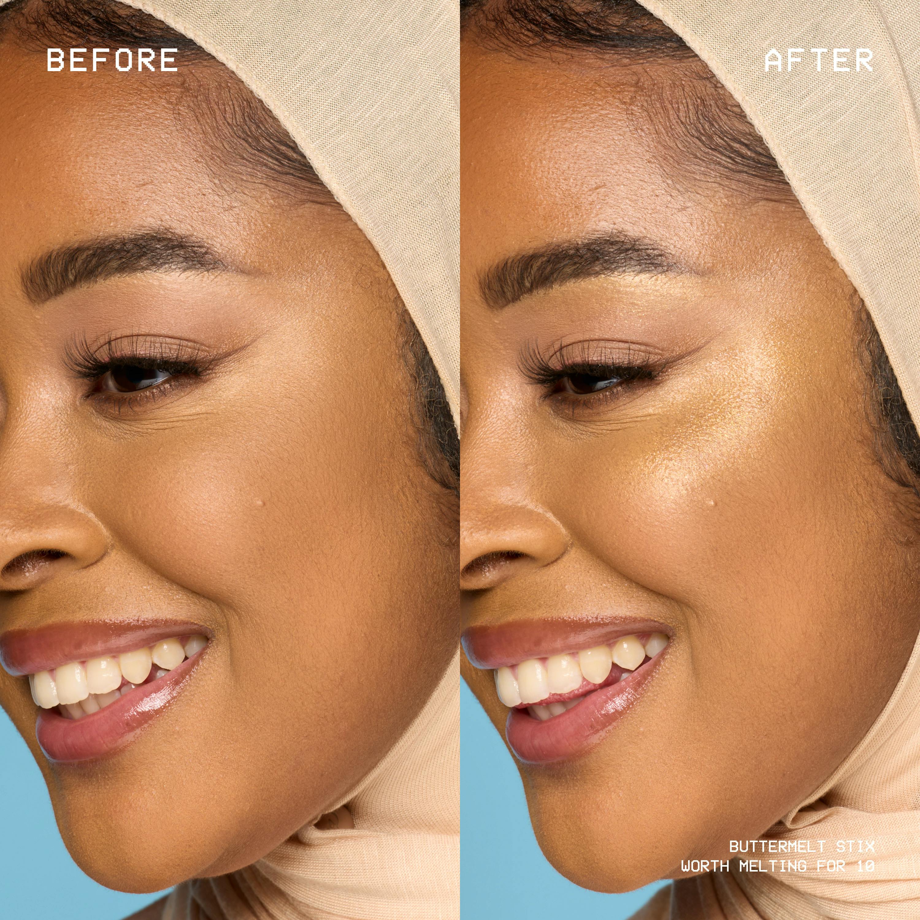 Everything is better with BUTTA! Our NYX Professional Makeup Buttermelt Glow Boosting Highlighter Stixs delivers a buttery smooth highlight to "butta glow" from head to toe. Infused with nourishing cupuacu and coconut butter, this stix provides a moisture-rich base for a seamless, creamy glide that melts right into your skin. Achieve an ultimate all-glaze glow without chunky glitter, perfect for illuminating high points of the face, layering for an all-over melty glaze on collarbones, arms, and legs. Get that butta soft feel, butta melty look, and butta glaze glow.