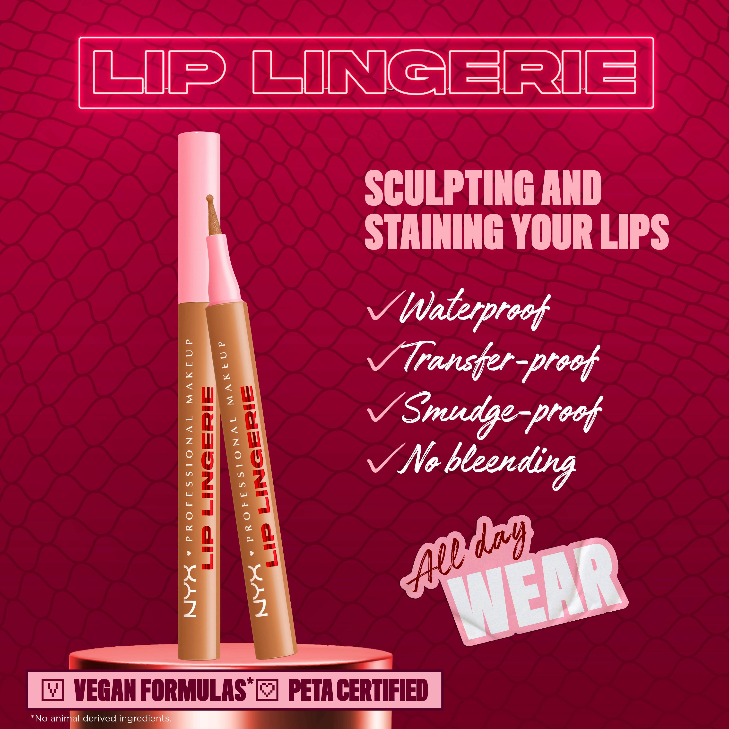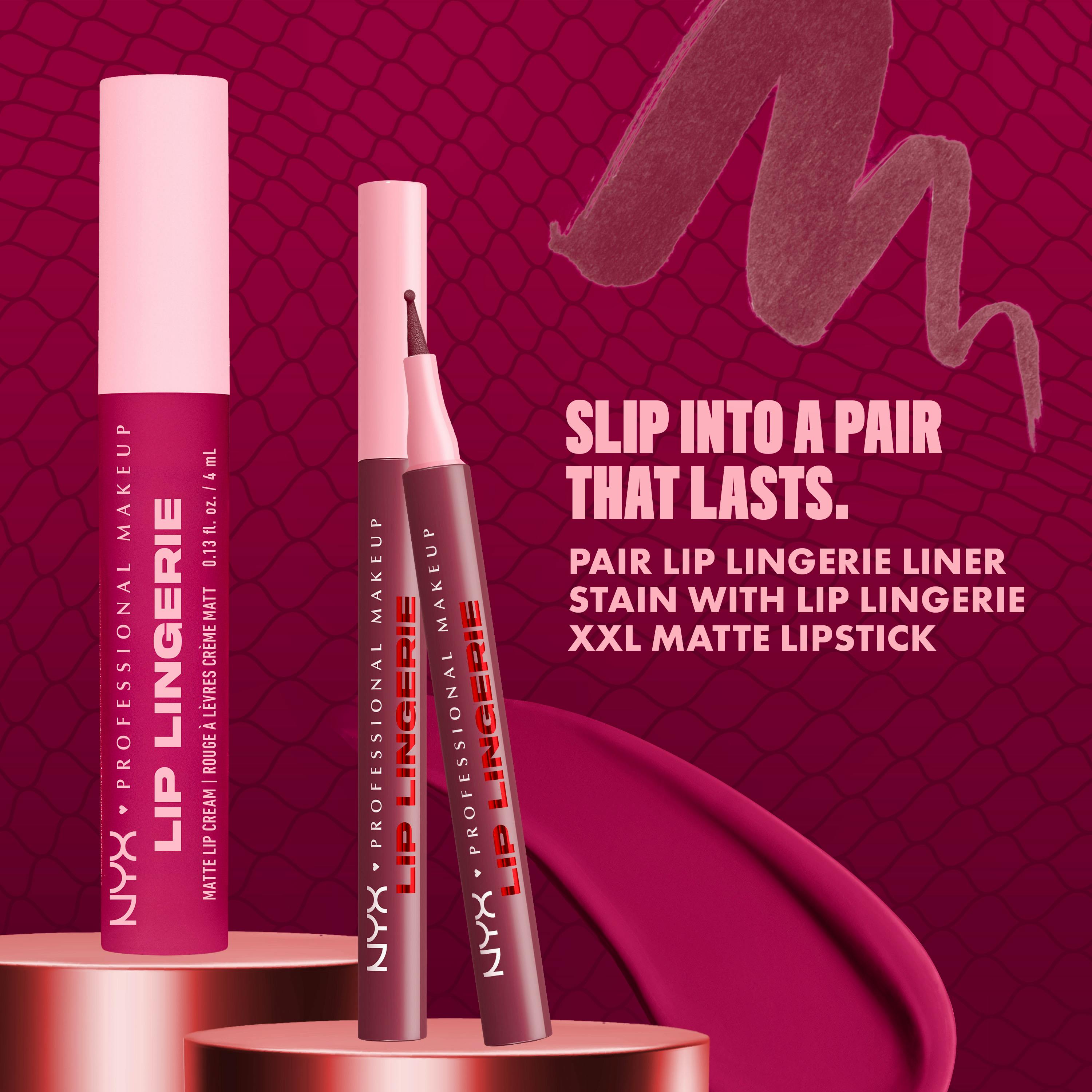 Stain it! Shape it. Sculpt it. Introducing the NYX Professional Makeup Lip Lingerie Liner Stain, your essential tool for sculpting and staining your lips. This innovative liquid liner stain delivers all-day, transfer-proof, smudge-proof, and waterproof staining wear, ensuring your lip look stays flawless. Designed with a versatile ballpoint felt tip, it effortlessly hugs every curve, allowing you to line with lace-like precision, contour for a pushed-up effect, or fill your entire lip with comfortable, lightweight color. Blend away any harsh lines for seamlessly sculpted lips with no bleeding. The formula melts onto your lips like silk, providing lasting definition.