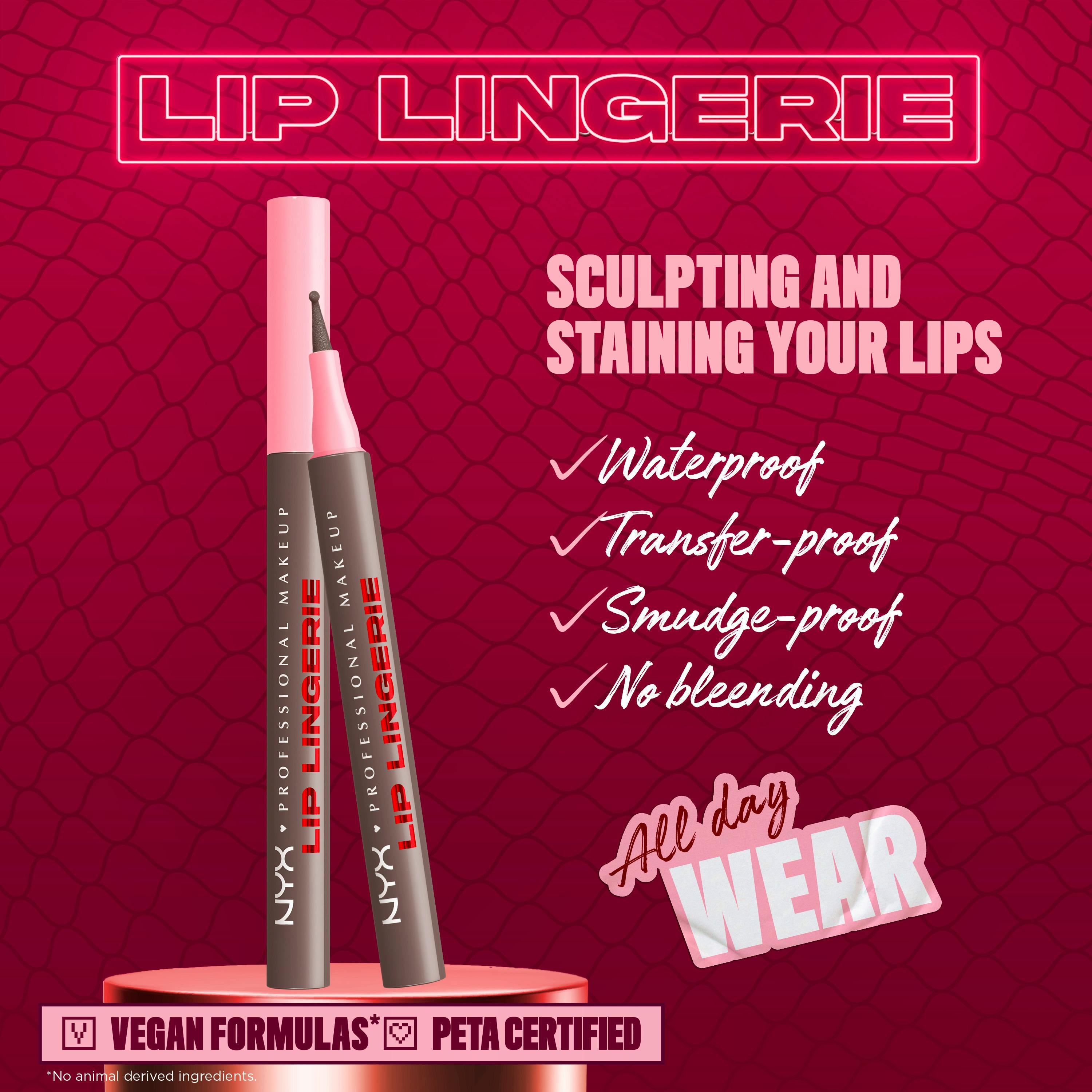 Stain it! Shape it. Sculpt it. Introducing the NYX Professional Makeup Lip Lingerie Liner Stain, your essential tool for sculpting and staining your lips. This innovative liquid liner stain delivers all-day, transfer-proof, smudge-proof, and waterproof staining wear, ensuring your lip look stays flawless. Designed with a versatile ballpoint felt tip, it effortlessly hugs every curve, allowing you to line with lace-like precision, contour for a pushed-up effect, or fill your entire lip with comfortable, lightweight color. Blend away any harsh lines for seamlessly sculpted lips with no bleeding. The formula melts onto your lips like silk, providing lasting definition.
