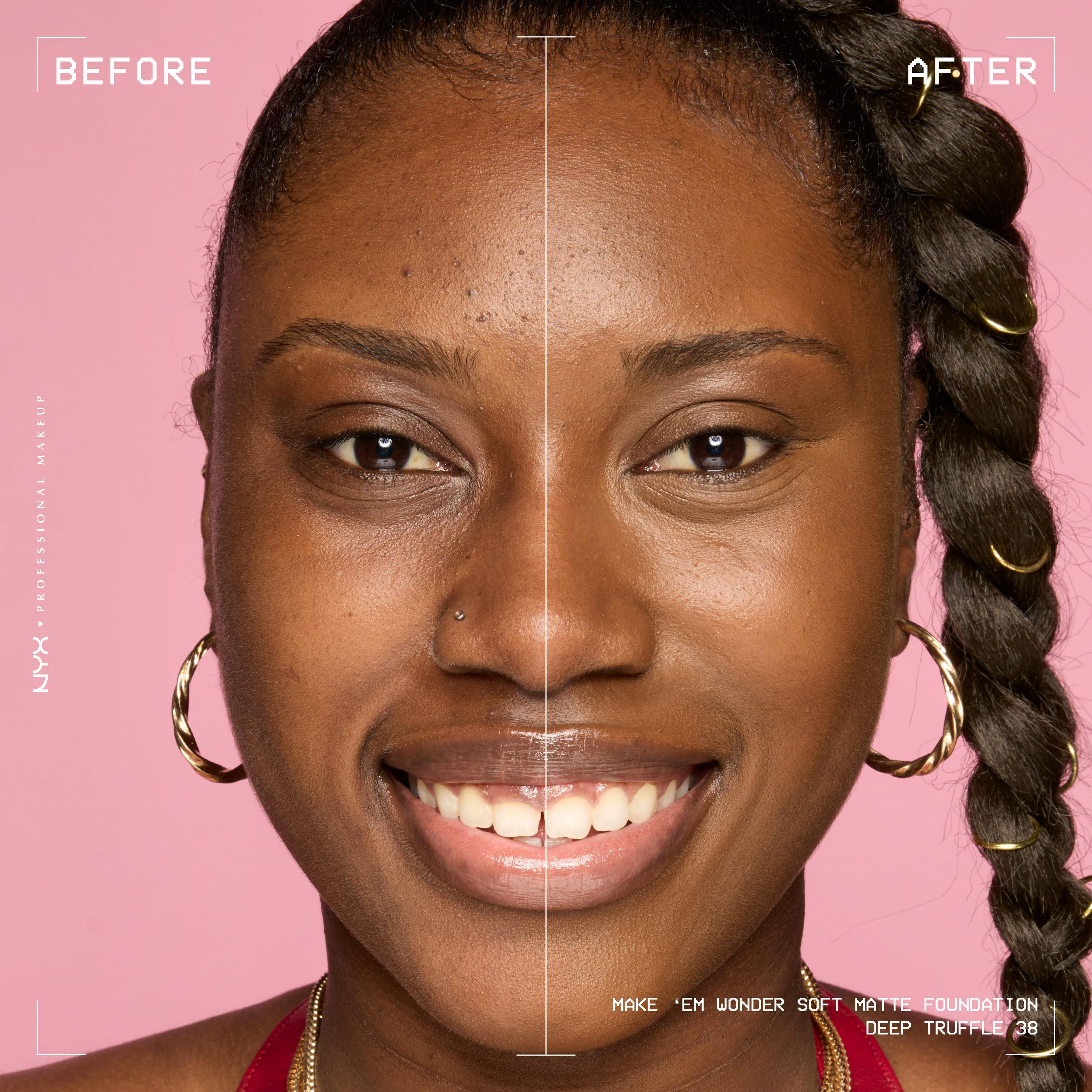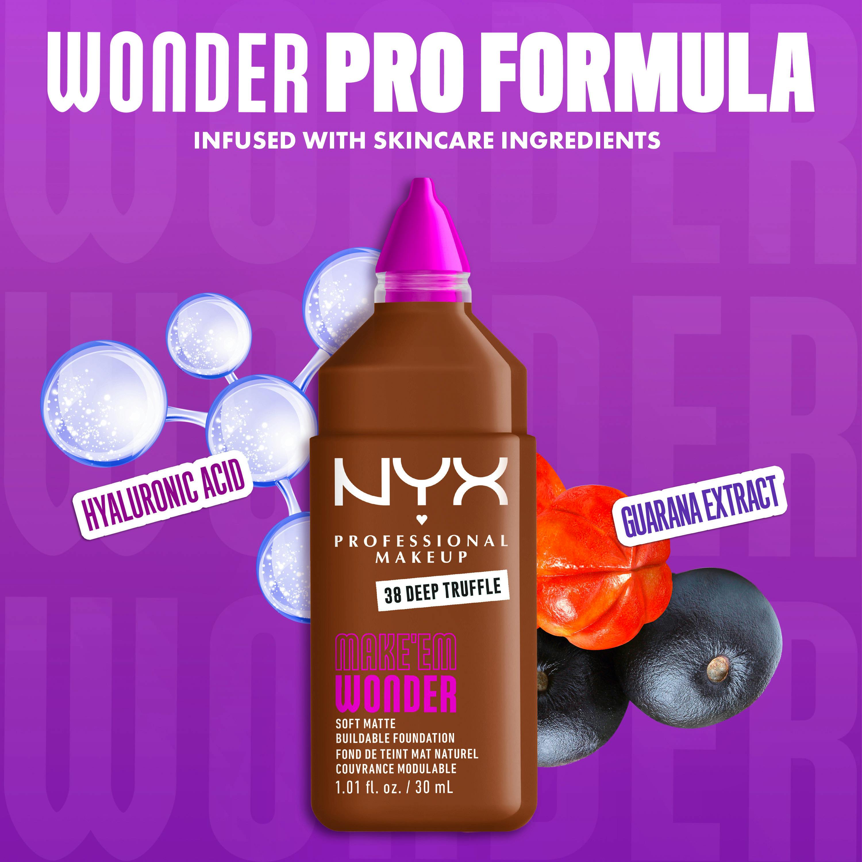 MAKE 'EM WONDER if it's foundation or if it's just your skin with this soft matte, buildable formula. NYX Professional Makeup Make'em Wonder foundation is infused with skincare ingredients that covers everything, yet feels weightless on the skin, providing all-day wear that looks like real skin – only smoother, more even, and brighter. Infused with Guarana Extract, and Hyaluronic Acid for instant hydration and a non-cakey feel. It's a buildable formula, allowing you to create any look, from the perfect no-makeup makeup to full glam. This foundation delivers: it's fade- and transfer-resistant, sweat-resistant, waterproof, and provides all-day shine control.