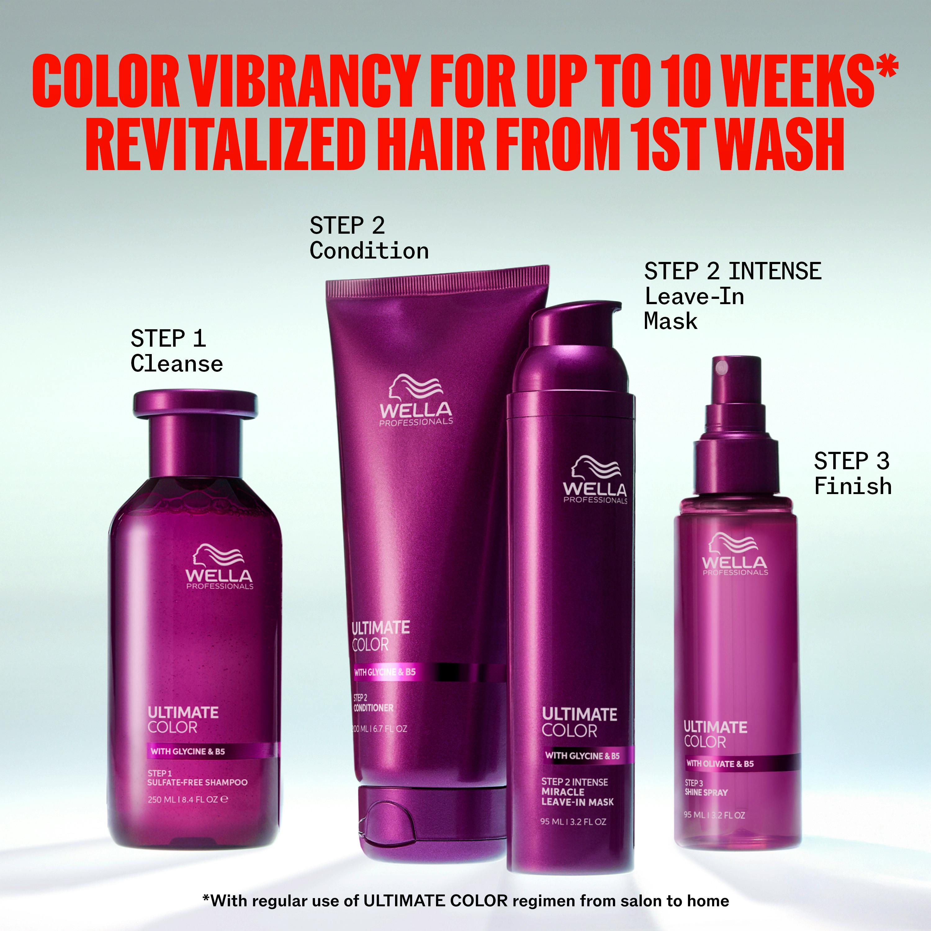 Wella Professionals Ultimate Color Shine Spray is a smoothing spray for color-treated hair. This lightweight spray instantly adds shine while leaving hair up to 4x smoother*. Formulated with olivate for smoothness and Pro-Vitamin B5 to lock in moisture, it keeps hair soft, silky, and manageable. Dermatologically tested and free of animal-derived ingredients. Your routine for vibrant, smooth, and radiant color.